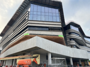 Les éléments liés à l’aménagement paysager extérieur — bancs, sièges sur mesure et terrasse — sont en train d’être mis en place afin de créer un espace extérieur accueillant.