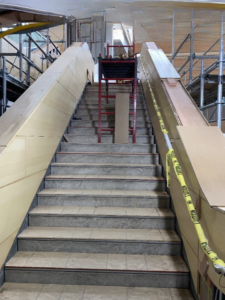 Photo 1 : Installation des menuiseries dans les escaliers à l’intérieur d’Ādisōke.